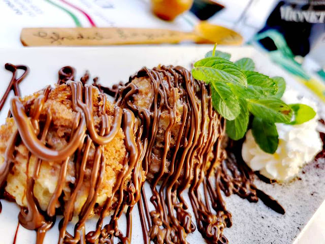 Șomloi este un desert unguresc mai puțin cunoscut decât gomboti cu prune, dar este fabulos - are blaturi de cacao și de vanilie cu multă nucă și stafide, bine însiropate cu rom, acoperite cu ciocolată (19 lei).